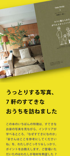 すてきなお家を見ると、「でもうちは無理」なぁんて思うこともあります。それはダメ、ダメ。やはり皆さんのおうちもすてきになってもらわなくっちゃ。ということで『すてきなおうちのつくりかた』は2部構成。chapter1はすてきなお家のご紹介で、chapter2は皆さんが実践するアイデアページです。でも…うちは無理、 なぁんて 言わせませんよ この本のいちばんの特徴は、すてきなお家の写真を見ながら、インテリアが学べるところ。「なぜすてきになのか」「皆さんはここを参考にしてくださいね」を、わたしがこっそり&しっかり、ポイントをお教えします。ご登場いただいたのはわたしが取材を熱望した7軒で、「本当にセンスがよくて、インテリアがうまくて、何より肩肘張らないのがかっこいい!」というお家です。写真を眺めているだけでもうっとり。うっとりする写真、 7軒のすてきな おうちを訪ねました