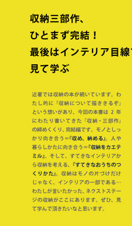 近著では収納の本が続いています。わたし的に「収納について描ききるぞ」という想いがあり、今回の本書は2年にわたり書いてきた「収納・三部作」の締めくくり、完結編です。モノとしっかり向き合う=『収め、納める』。人や暮らしかたに向き合う=『収納をカエテミル』。そして、すてきなインテリアから収納を考える、『すてきなおうちのつくりかた』。収納はモノの片づけだけじゃなく、インテリアの一部である。わたしが言いたかった、ネクストステージの収納がここにあります。ぜひ、見て学んで頂きたいなと思います。収納三部作、 ひとまず完結! 最後はインテリア目線で 見て学ぶ